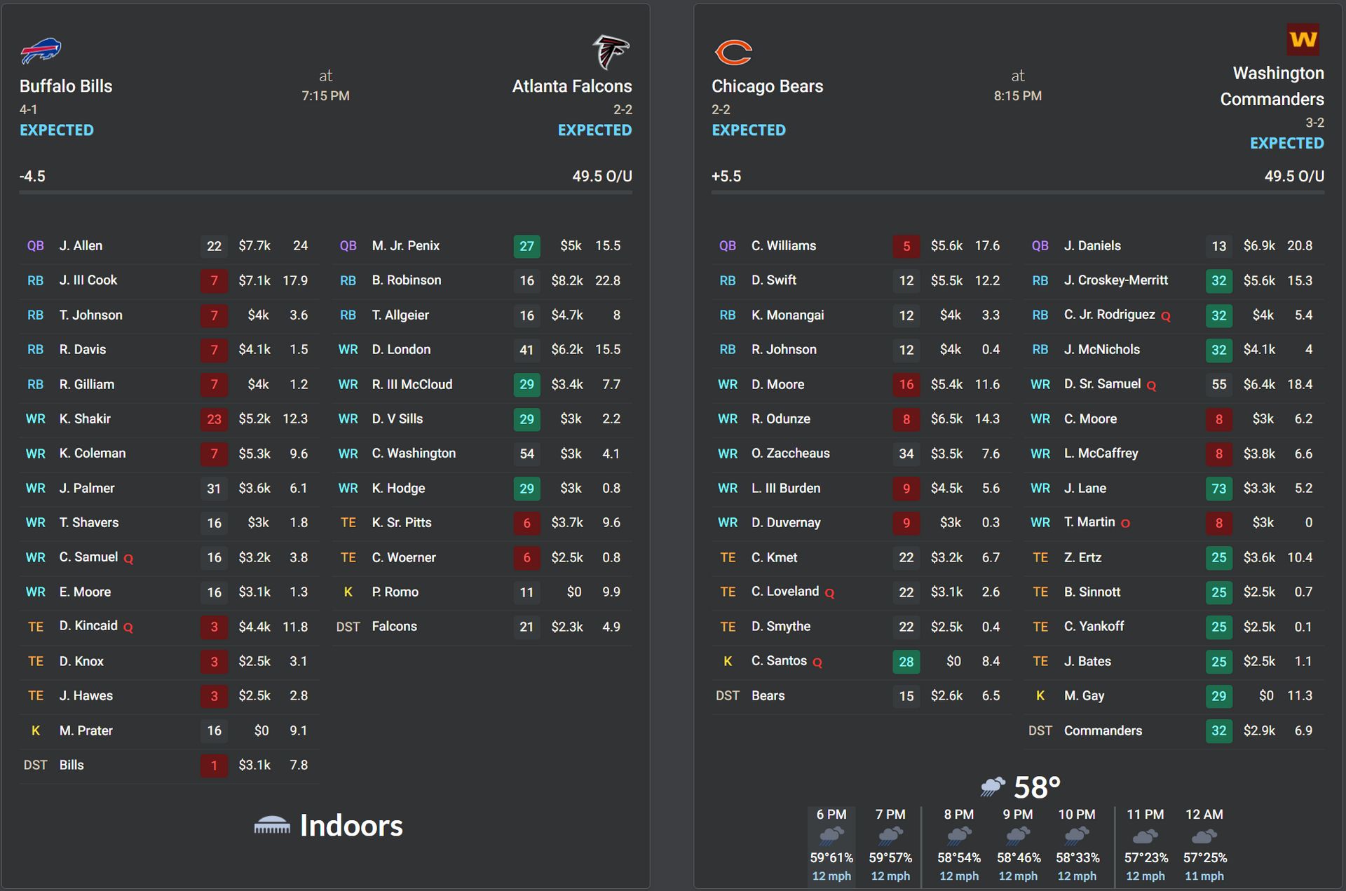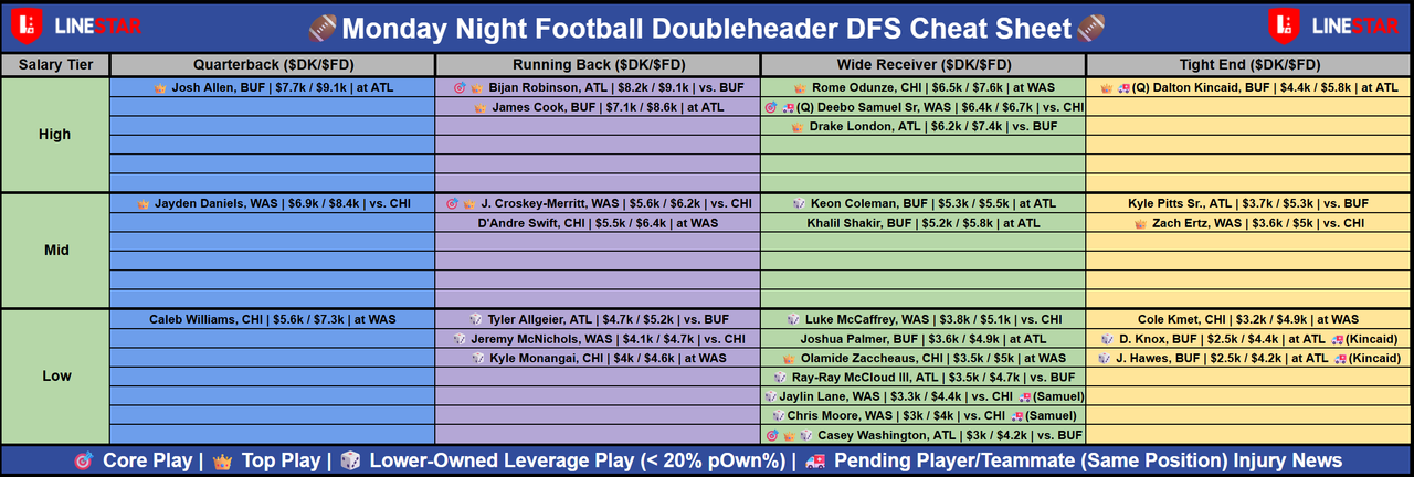 Another overlapping Monday primetime doubleheader arrives, which will feature the Bills at the Falcons and the Bears at the Commanders! Both of these matchups are pinned with high 49.5 over/unders, and there are plenty of fantasy-relevant players to choose from this evening.