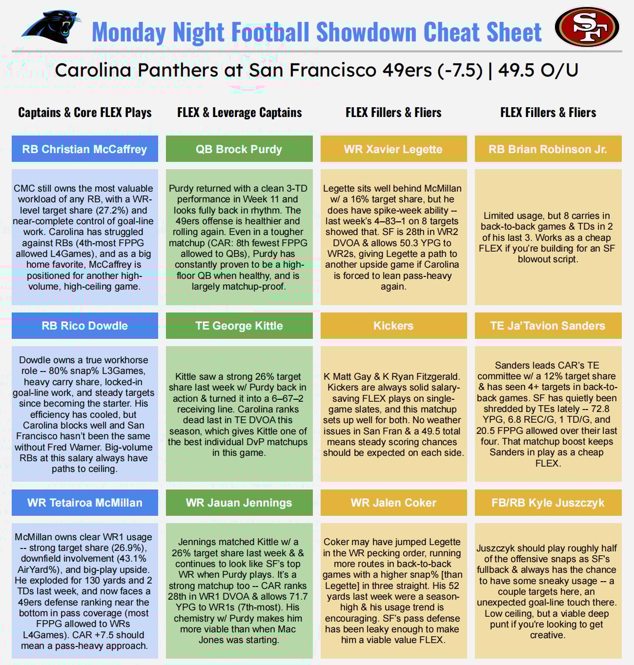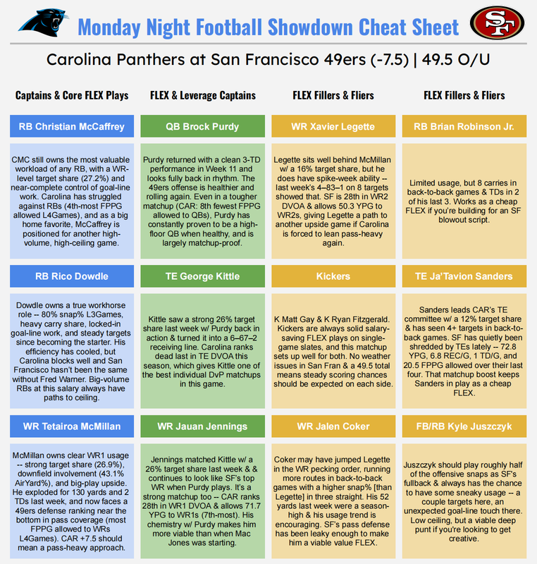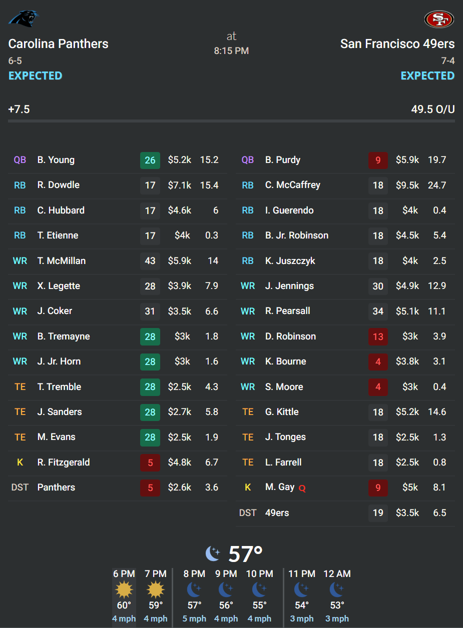 Single Game Roster Construction (in order of preference): 4-2 49ers, 3-3 Balanced, 4-2 Panthers, 5-1 49ers