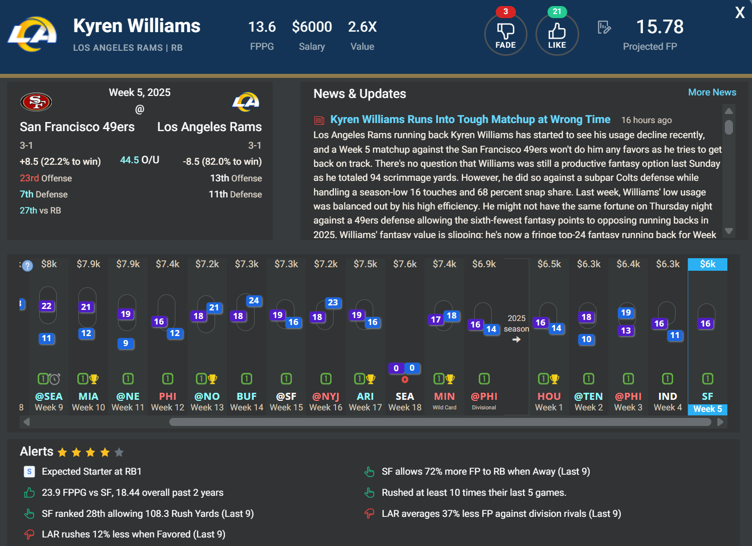 *RB Christian McCaffrey, K Eddy Pineiro, RB Kyren Williams: CMC is the 49ers offense right now, and he could easily push for 30 total touches in this game. Heāll be a major focal point of the Ramsā defense, but volume is volume. Kickers do tend to correlate well with their teamās RB (someone has to move the ball to set up FG attempts), so weāll roll Pineiro in the FLEX and run it back with Kyren Williams on the other side. We often see these TNF matchups turn into RB-heavy games, and youāre locking up a huge volume of touches by rolling CMC and Williams in the same lineup.