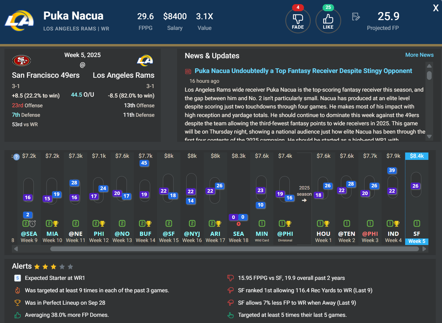 WR Puka Nacua, LAR: Nacua is nearing historic numbers through four weeks. Thus far, he is averaging 12.5 targets/gm, 10.5 receptions/gm, and 125.8 YPG. On a 17-game pace, that would equate to 213 targets, 179 receptions, and 2,138 yards! He is simply the safest non-QB floor play in fantasy football at the moment. Iād expect some down games along the way, and perhaps weāll see some regression hit tonight. The Rams are heavy favorites in this one, so they may not need to throw a ton, and the 49ers have also ranked 4th in WR1 DVOA. But, as it stands, Nacua and his dominant 37.6% Target% make him a clear captain/MVP candidate.