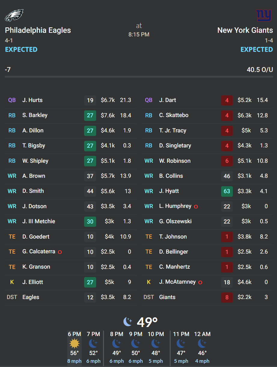 RB Saquon Barkley, PHI: The âBarkley revenge narrativeâ will be a big talking point surrounding this game, and I totally get it -- Saquon could certainly have a little extra juice in the tank tonight, and he ran for 176 yards on 17 attempts against his former team in week seven of last season. But he also hasnât been as dominant this season, averaging a pedestrian 3.2 YPC. However, he has been facing some tougher run defenses. Despite the general lack of production from a yardage standpoint, Barkley has found the end zone in 4 of 5 games, and the volume has remained strong (20.0 touches/gm). Aside from the revenge factor, the matchup itself is also a main reason why Barkley will remain a top captain/MVP option. The Giants rank dead last in rush DVOA, and theyâve surrendered the 6th-most FPPG to RBs this season. Even with the threat of Jalen Hurts getting pushed into the endzone on the goal line, the floor for Barkley tonight does feel like 100+ yards and a TD. In a potential lower-scoring game, that may be plenty enough for him to end the night as the optimal captain/MVP.