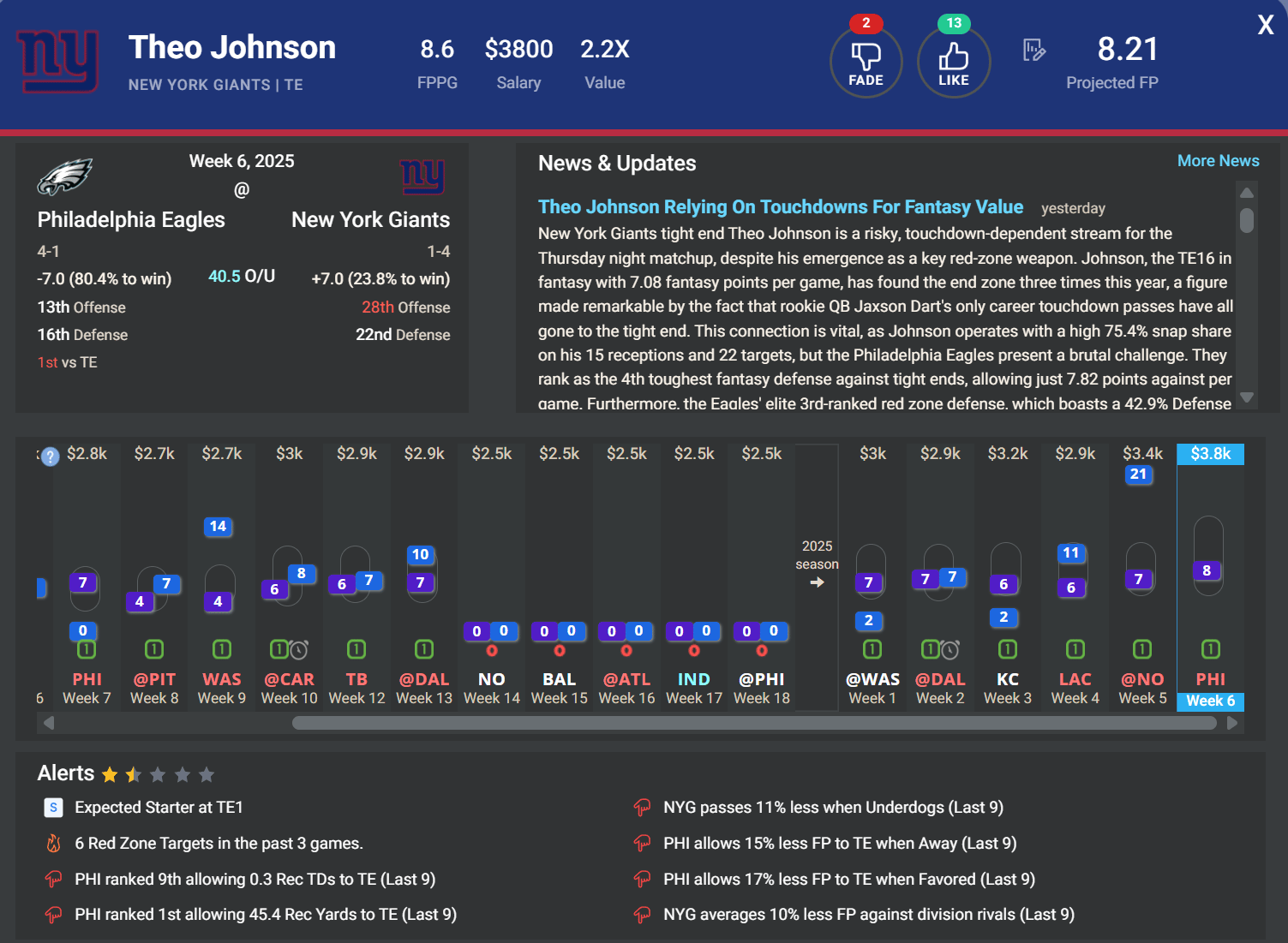 TE Theo Johnson, NYG: Theo Johnson could see an expanded role tonight with the Giantsâ current WR woes, and we can likely expect them to deploy plenty of 12 personnel (1 RB, 2 TEs, 2 WRs). Johnson has also shown a strong connection with rookie QB Jaxson Dart, particularly in the redzone, where he has been on the receiving end of all three of Dartâs passing TDs over the last two weeks. He owns a monster 36.4% RedZone Target% on the season. It is not an ideal matchup whatsoever (PHI: 1st in TE DVOA, 5th fewest adjusted FP allowed), but, if the volume is there, along with perhaps another TD grab, then Johnson is one of the better bets on the NYG side to end the night as an optimal play.
