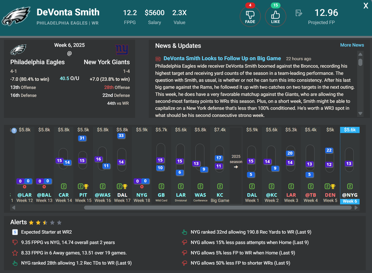 WR DeVonta Smith, PHI: With Hurtsâ recent success through the air, Smith has put forth a couple of strong receiving lines over the last three games, and heâll have a solid shot at another big night this evening. Smith has hauled in 83.3% of his targets this season while running a route on 97.4% of Jalen Hurts' dropbacks. He has run around 60% of his routes out of the slot, which equates to the best matchup for PHI WRs as the Giants have allowed the 4th-most FPPG to slot WRs this season.