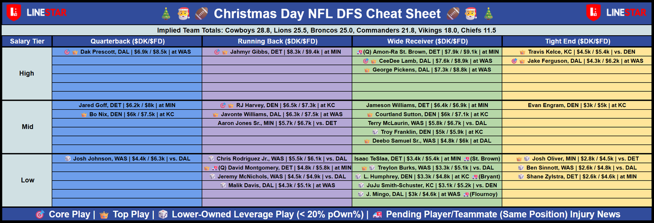 - Top NFL DFS Plays Week #17 | Christmas Day Tripleheader Cheat Sheet! ๐๐ ๐