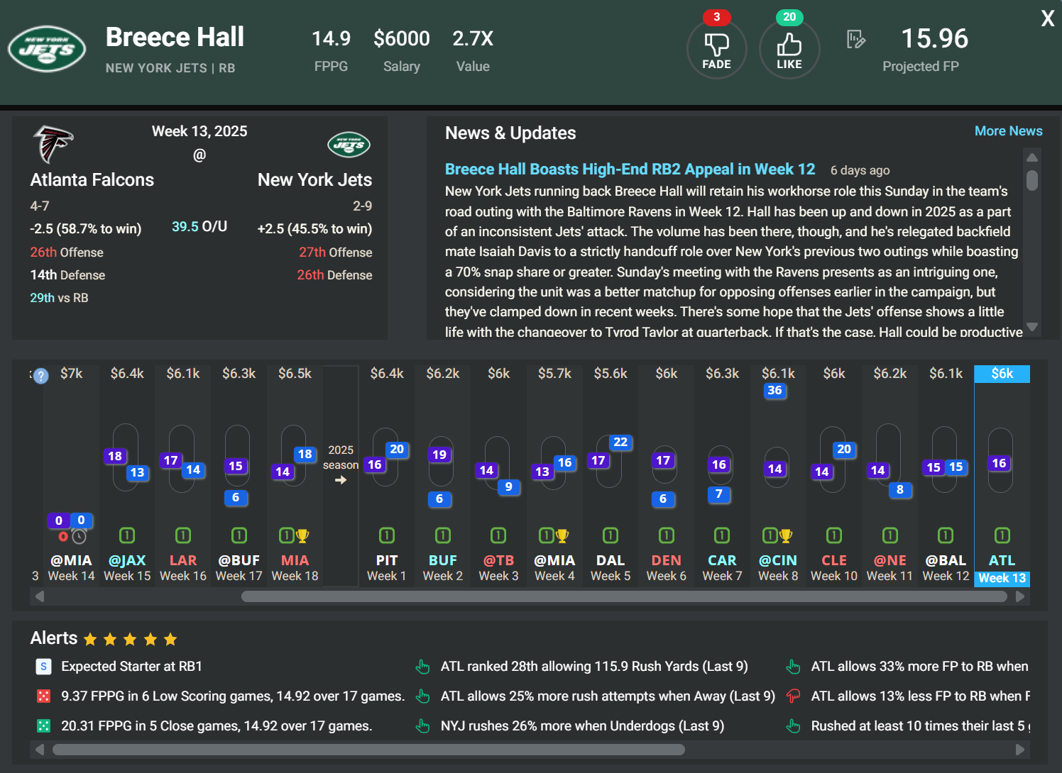 Breece Hall, NYJ | DK: $6k, FD: $7.4k | vs. ATL