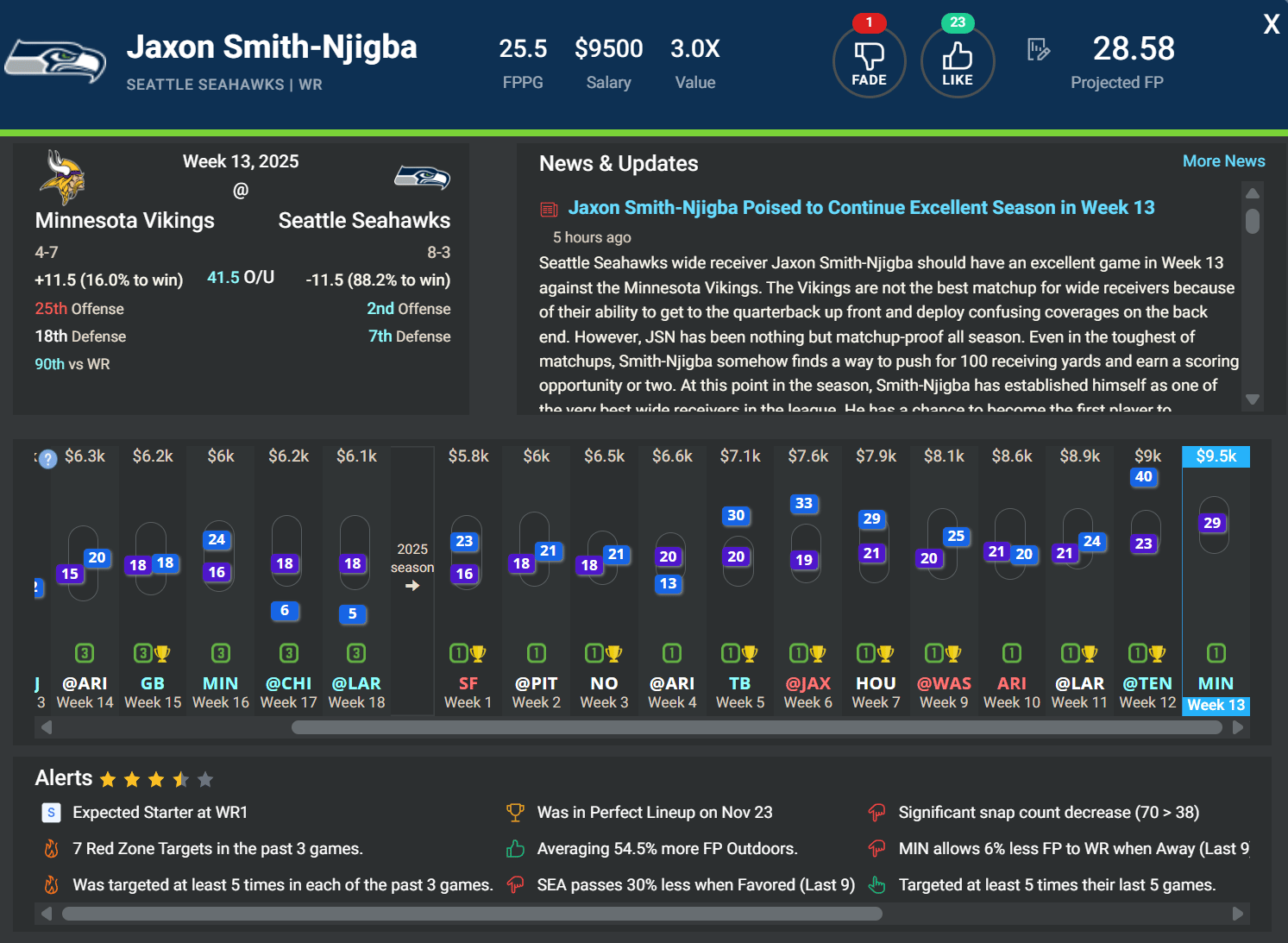 JSN enters Week 13 as the slate’s premier ceiling option at wide receiver, and his recent production backs that up in a big way. He has cleared 20 DKFP in seven straight games and is averaging 28.8 DKFP during that stretch, with six 100-yard outings in his last seven contests. Last week’s eruption against Tennessee (8/167/2 on 10 targets) was just the latest reminder of how dominant he has been, and he has now piled up 1,313 yards and seven touchdowns on the season. Even with his salary rising to the top of both sites, he has consistently beaten baseline expectations nearly every week. Minnesota has been tough on opposing receivers, but Smith-Njigba has reached the point where matchup concerns matter far less. His target share, explosive-play ability, and weekly consistency keep his ceiling among the highest on the slate, and he remains a strong pay-up option for anyone building around a premium WR anchor.