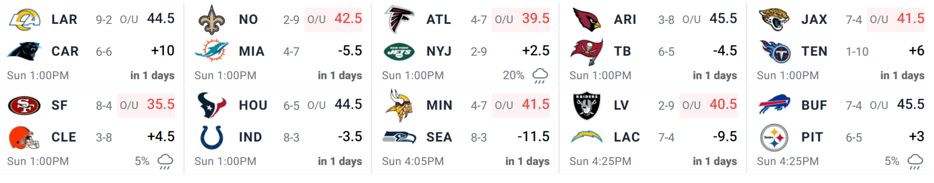 Week 13 brings us a ten-game main slate, and at first glance, the defining feature is the sheer number of low totals across the board. The majority of matchups sit in the high 30s or low 40s, and only four games crack the mid-40s. It sets the stage for a slate that could easily play tighter and lower-scoring than what we have seen in recent weeks, which typically increases the importance of avoiding missteps. Smaller scoring environments tend to punish wasted salary or thin value plays more than usual, while rewarding lineups that simply get solid production from each roster spot.