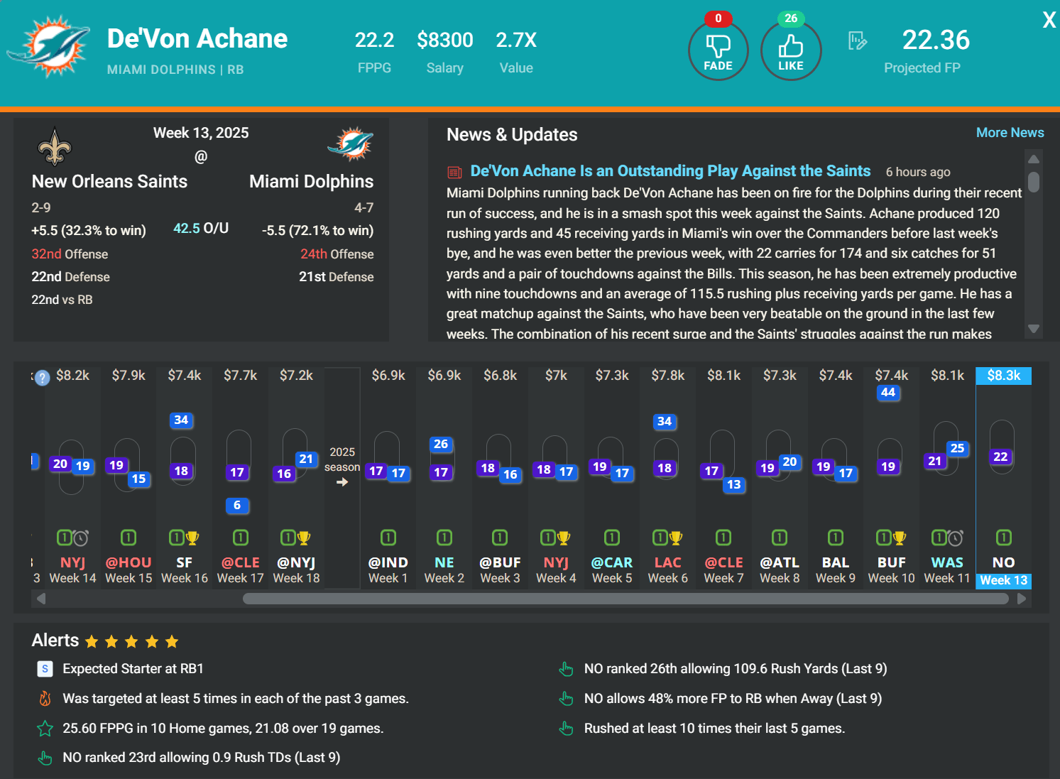 Few running backs bring Achane’s combination of workload, explosiveness, and receiving volume, and he comes out of the Week 12 bye in excellent form. He handled 21 carries and five receptions in the win over Washington before the break, turning that into 165 total yards and 24.5 DKFP without finding the end zone. That performance extended a run of four straight games with 15+ DKFP and came just two weeks after his 225-scrimmage-yard, two-score eruption against Buffalo. His ability to create chunk plays on the ground while also contributing heavily as a receiver gives him one of the most bankable workloads on the slate. The matchup with New Orleans rates as relatively neutral overall, but the Saints have shown cracks recently, giving up 131.4 rushing yards per game and five RB touchdowns in their past five outings. If Miami continues leaning on Achane as the centerpiece of the offense, he profiles as one of Week 13’s strongest pay-up options and a clear threat to post another slate-breaking performance.