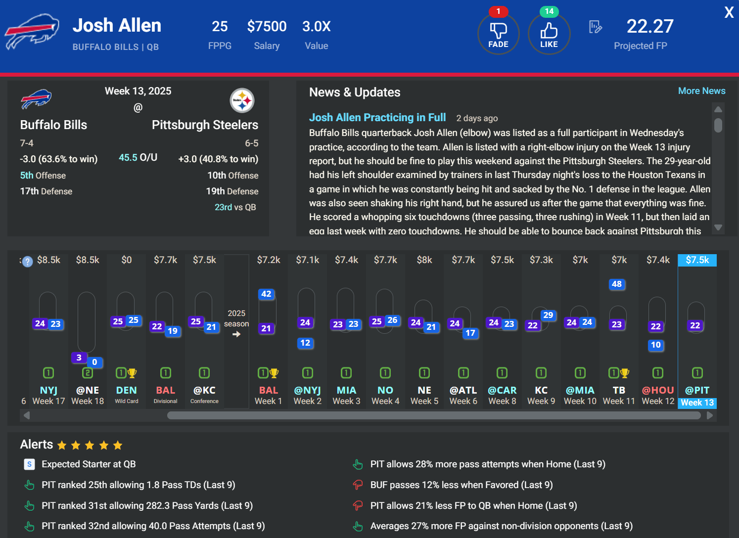 Josh Allen, BUF | DK: $7.5k, FD: $9.4k | at PIT