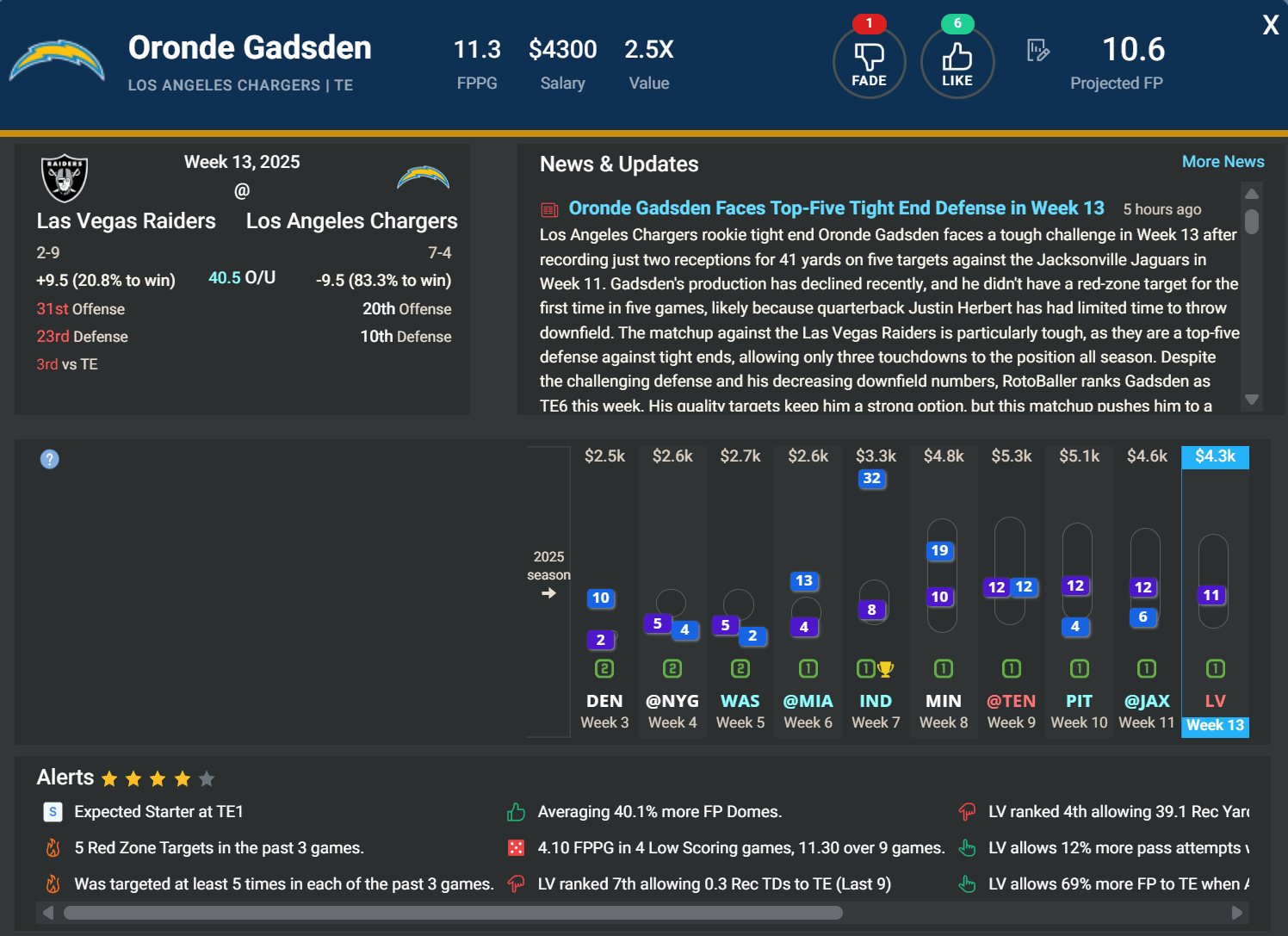 For those not paying up for McBride or Kittle, Gadsden profiles as one of the stronger mid-range TE values on the slate. Before the Chargers’ bye, the rookie had carved out a consistent role with multiple catches in six straight games and at least five targets in every one of those outings. He averaged 6.3 targets per game during that stretch and showed reliable usage even in Los Angeles’ tougher matchups. The bye comes at a good time for an offense that needs to re-center its passing game, and Gadsden has been one of the more steady pieces. Las Vegas has handled tight ends well this season, but there is room for regression -- the Raiders have allowed the 4th-fewest FPPG to TEs, but rank a middling 12th in TE DVOA. Volume should keep Gadsden in play and, with the Chargers likely leaning on their short-to-intermediate passing attack at home, he projects for another solid workload in a game where Los Angeles needs him involved.