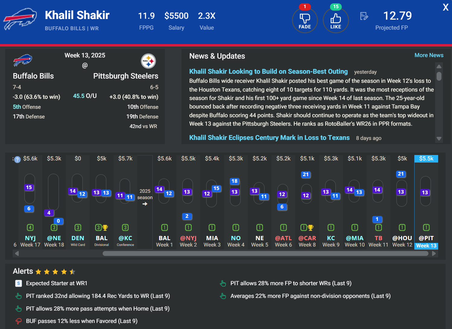 Khalil Shakir, BUF | DK: $5.5k, FD: $6.3k | at PIT